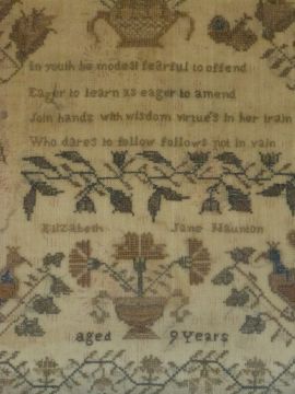 Two 19thC embroidery samplers by Elizabeth Jane Naunton, aged 9, and Maria Wilson, largest 35 x 31cm