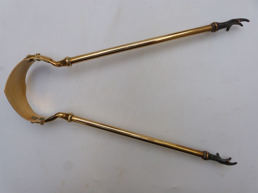 Trench art companion set made from a shell case, dated 1941, horse brasses on leather strap and chestnut roaster, height of companion set 49cm