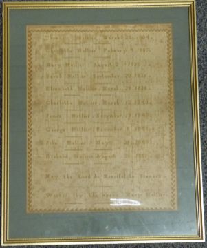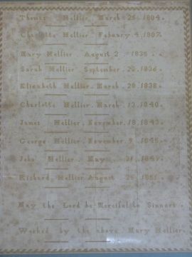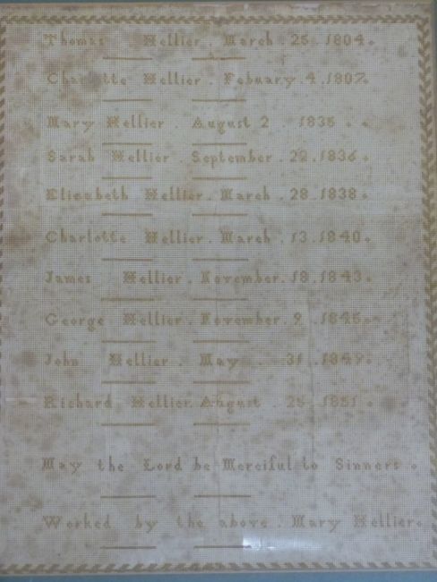 Two Victorian samplers, one detailing the Hellier family from 1804 and another by Betsy Duffus Rush 1854, both approximately 36 x 28cm