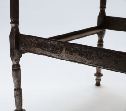 Georgian steel or similar footman with mortise and tenon joints and riveted slats, raised on stepped feet, W38 x D30 x H29cm