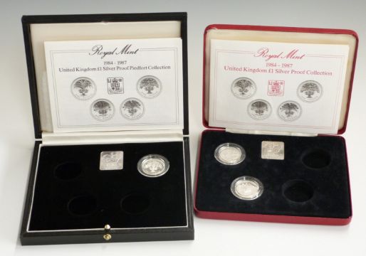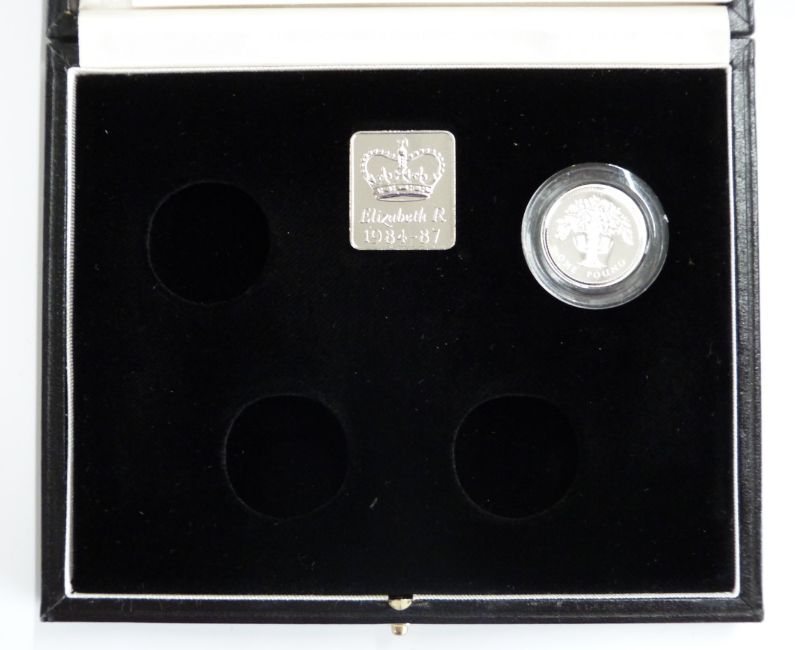 Silver proof £1 Piedfort coin 1987 in case with certificate for 1984-1987 UK £1 Silver Proof Piedfort Collection (case is for four coins), together with two silver proof examples for 1985 and 1986, with certificate in case for 1984 -87 UK £1 Silver Proof Collection