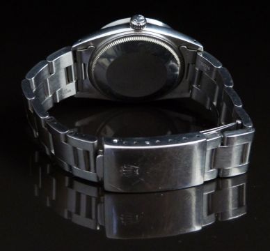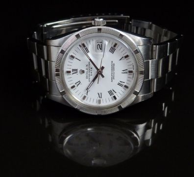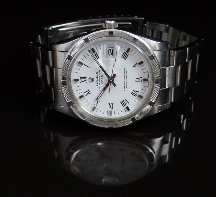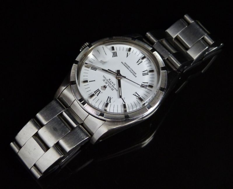 Rolex Oyster Perpetual Date gentleman's automatic wristwatch ref. 15010 with date aperture, Roman numerals, luminous silver hands and hour markers, white dial and stainless steel case, on stainless steel bracelet, case diameter 34mm, serial number 8590949, with chronometre certificate, service receipts and related paperwork