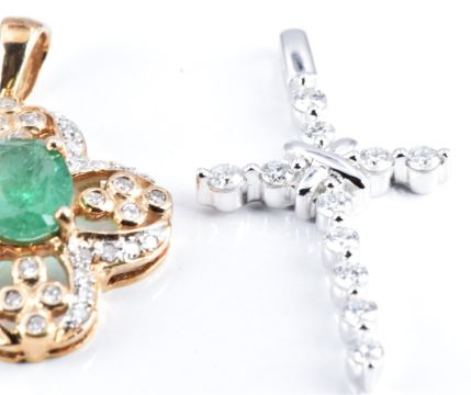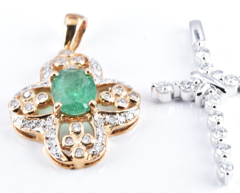 A 9ct gold pendant set with an emerald and diamonds and a 9ct white gold cross pendant set with diamonds, 3.8g