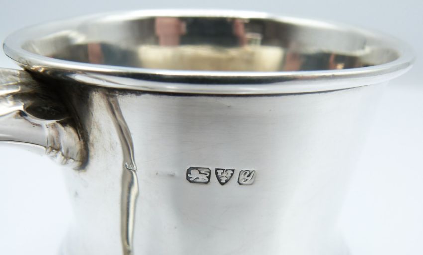 George V hallmarked silver tankard or mug, Chester 1924 maker's mark rubbed, height 7cm, together with two hallmarked silver twin handled trophy cups, weight 139g