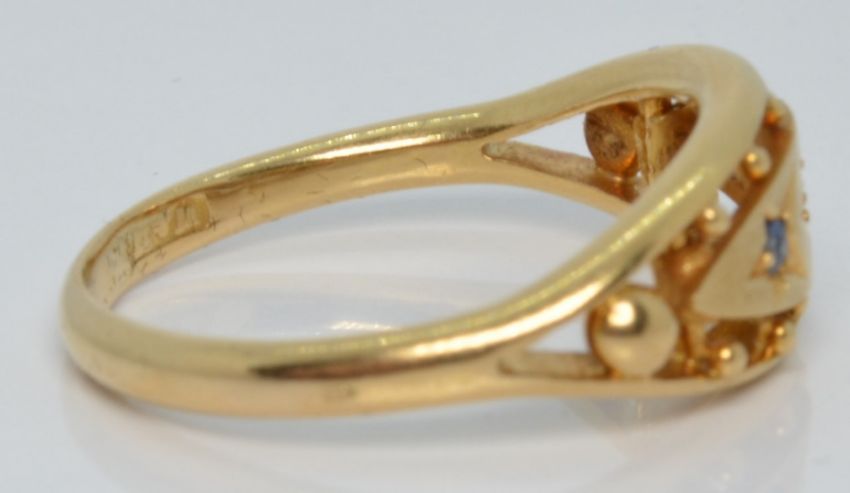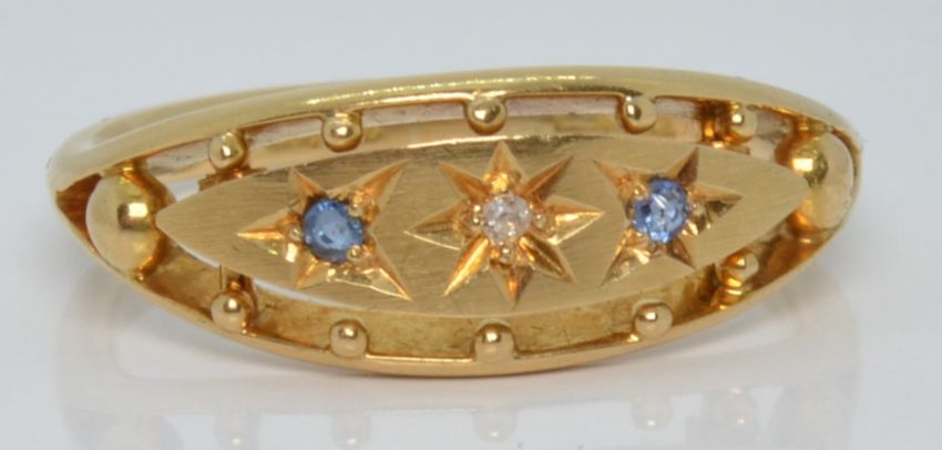 An 18ct gold ring set with a diamond and sapphires, Birmingham 1918, 4.0g, size P