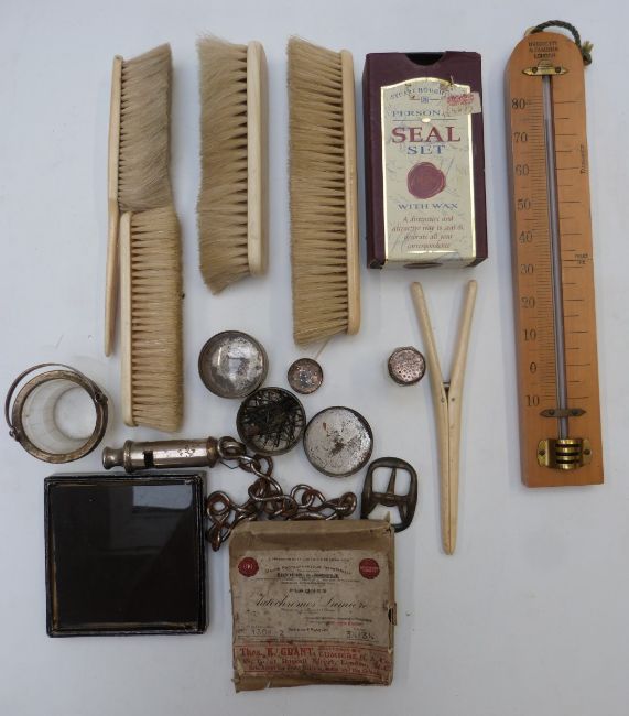 Negretti & Zambra thermometer, French glass photographic plate in box, dressing table items, 'The City Whistle' on chain, pounce pot, magnifying box etc