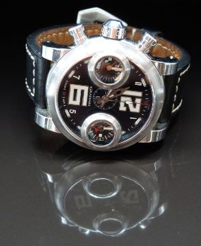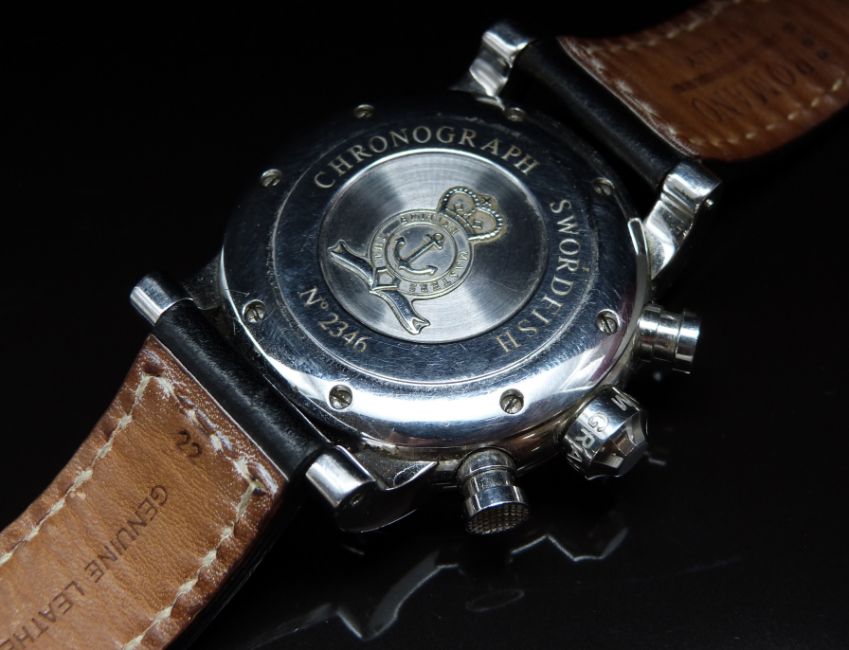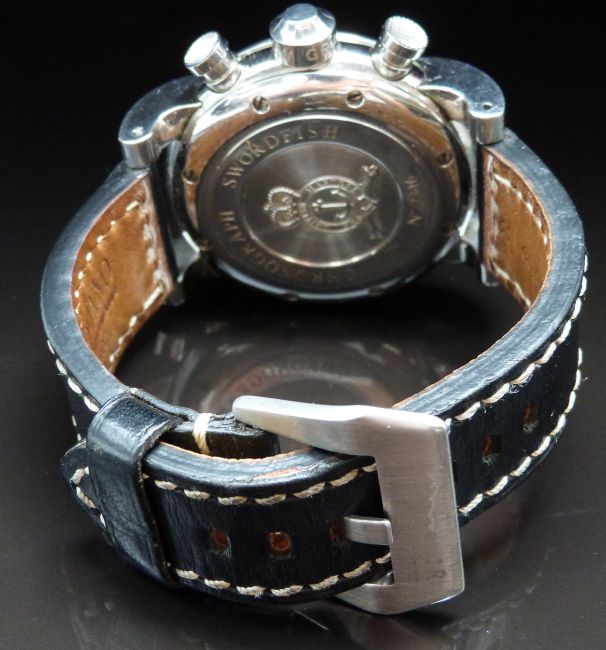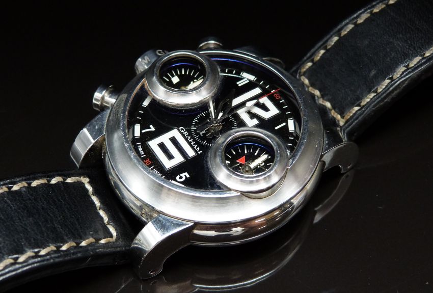 Graham Swordfish Booster gentleman's automatic chronograph wristwatch ref. 2SWAS.B14A.K06B with luminous hands and hour markers, black dial, stainless steel case and automatic movement, on black leather strap, case diameter 46mm, limited edition 2346