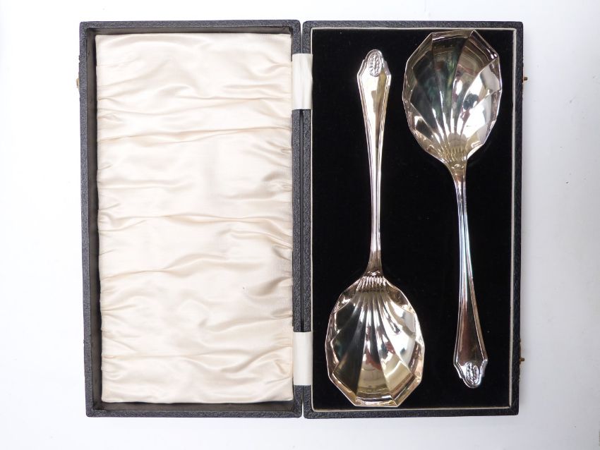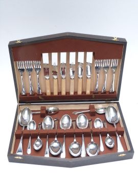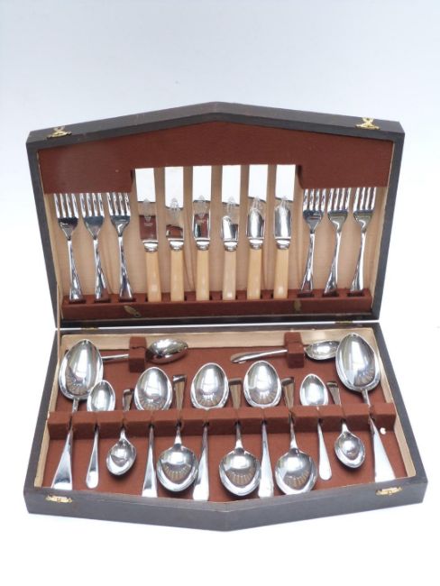 Quantity of cased silver plated cutlery to include serving spoons, fish eaters, six place setting Stainless canteen and a cased travelling brush set