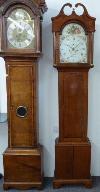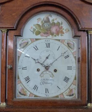 I H Barker, Sodbury early 19thC longcase clock, with 31cm painted Roman dial, the spandrel corners decorated with shells, nesting bird and roses to the arch and date aperture, oak case with full length arched door, swan neck pediments and brass capitols to pillared hood, the 30 hour movement striking on a gong, the whole raised on bracket feet, H214cm