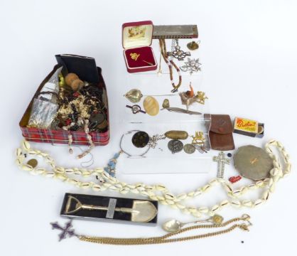 A collection of jewellery including necklaces, silver brooch, other brooches etc