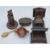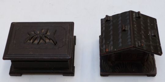 Black Forest bear pen holder, hinged inkwell in the form of a house or chalet, a carved box, treen quaich, a hinged metal oval casket with relief moulded decoration and a horn spoon with white metal cartouche, tallest 12cm
