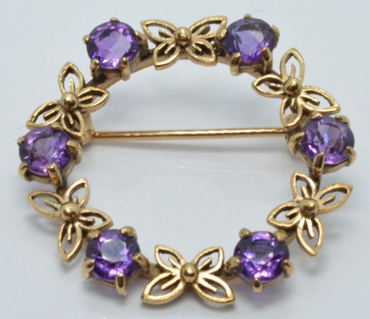 A 9ct gold brooch set with amethysts and butterfly design, diameter 3cm, 5.2g
