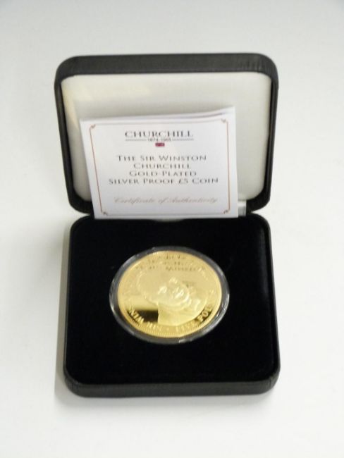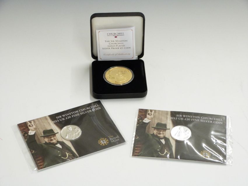 Sir Winston Churchill gold plated silver proof £5 coin, in case with certificate, together with two Royal Mint £20 2015 fine silver Churchill coins, in presentation packs