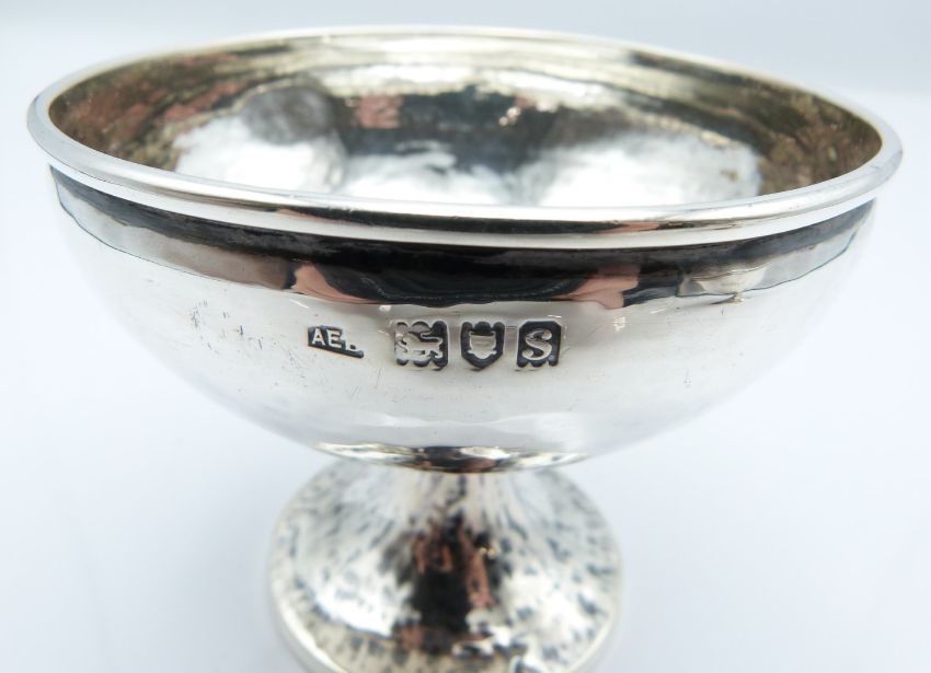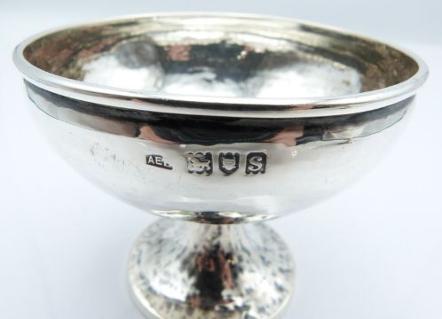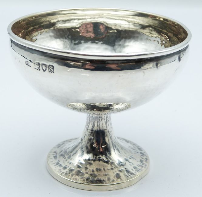 WITHDRAWN    Pair of Albert Edward Bonner Arts and Crafts hallmarked silver bon bon dishes with hammered finish, London 1913, height 7cm, weight 130g