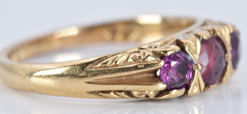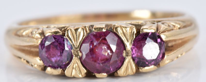 A 9ct gold ring set with three round cut garnets, 3.1g, size M