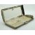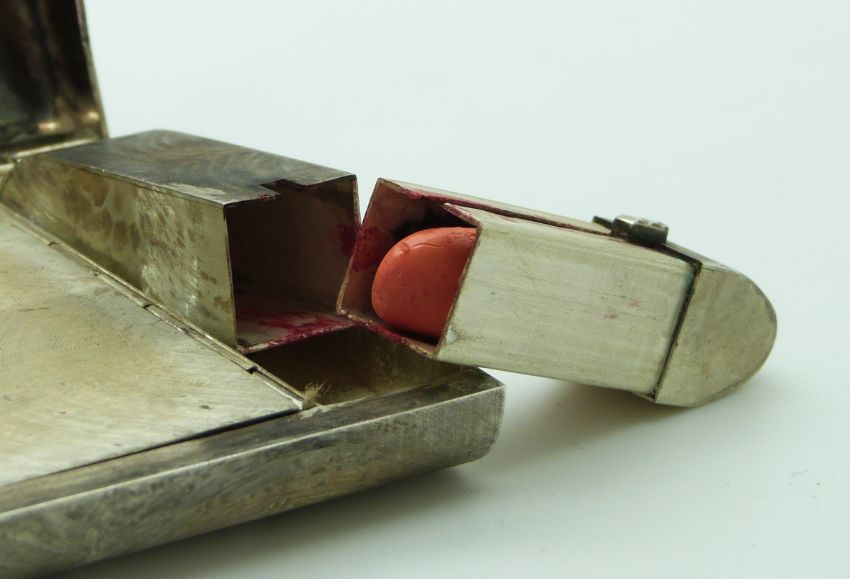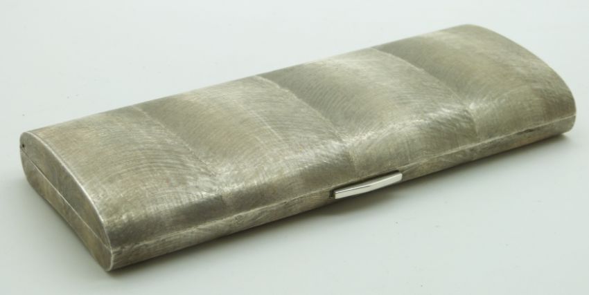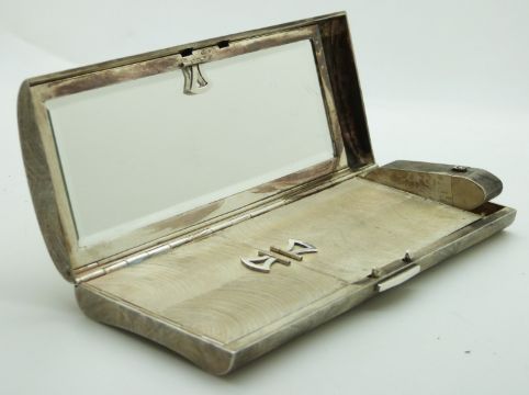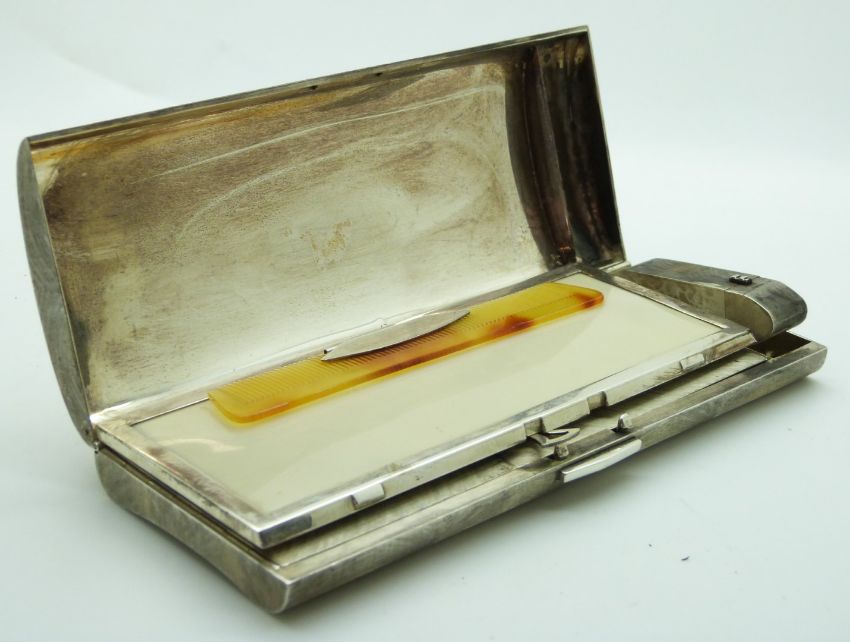 Gucci sterling silver Minaudiere, probably by Antonio Fallaci. The fitted interior with hinged ivorine-backed mirror with hinged clip holding comb, the other half comprising hinged compartment with compact, another hinged compartment and a hinged integral lipstick. The outer case in retro brushed silver finish, impressed Sterling silver and with Italian silver marks, made in Italy and Gucci marks. In original box, length 17 x depth 7cm