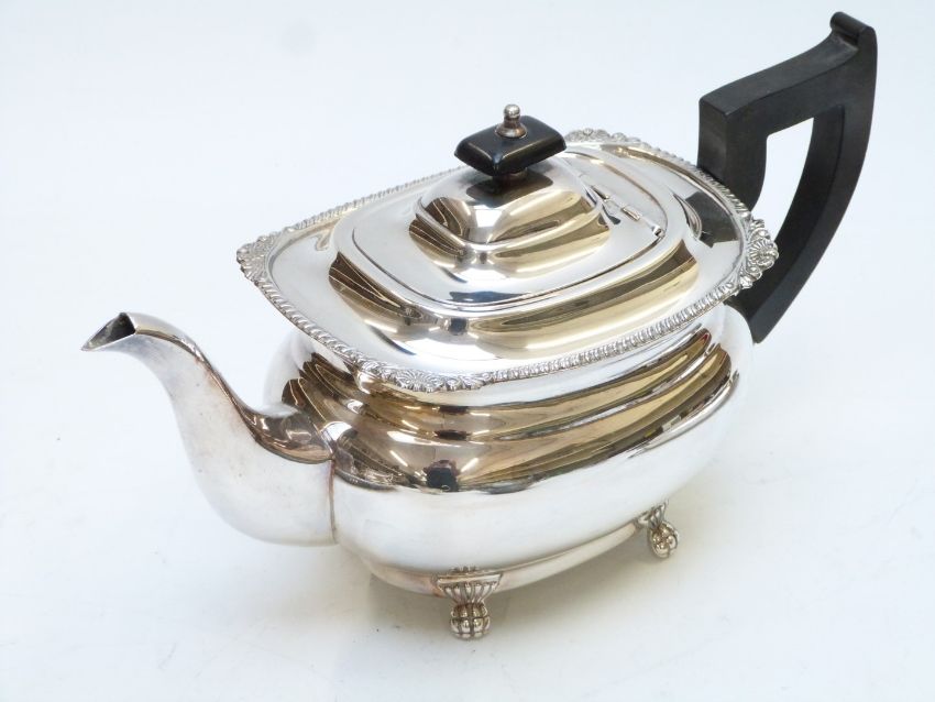 Silver plated three piece tea set, circular galleried tray, diameter 33cm, two sauce boats, mounted claret jug etc