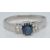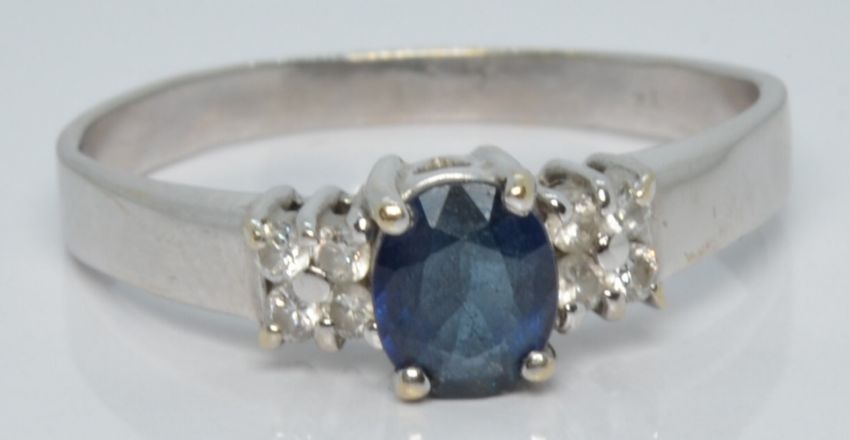 A white gold ring set with an oval cut sapphire and four diamonds to each shoulder, 3.4g, size R/S