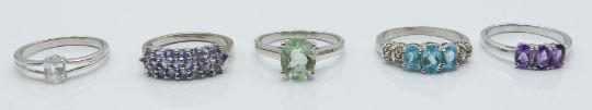 Ten silver rings set with amethyst, tanzanite, turquoise and blue diamond, zircon, aquaprase, green quartz, garnets, apatite, topaz and fluorite, with certificates