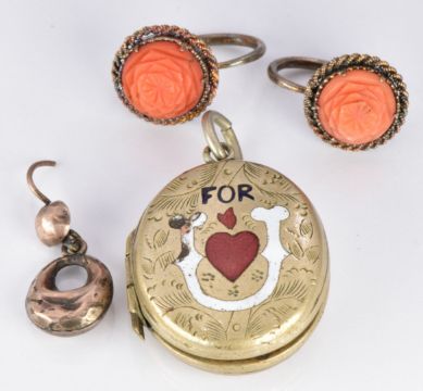 A pair of Victorian earrings set with carved coral and a Victorian locket (2.5cm diam)