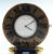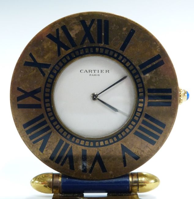 Cartier brass folding travelling clock, the white dial with inlaid blue enamel Roman numerals and blued hands, sapphire inset crown and quartz movement, case diameter 5.5cm, serial number 357101533