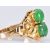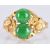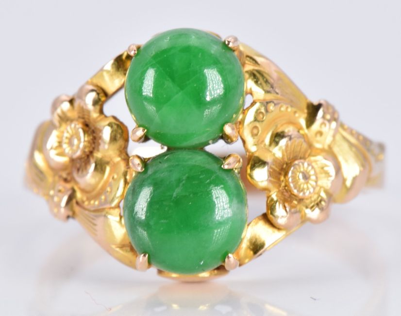 A 14k gold ring set with two jade cabochons with floral embossed shoulders, 3.1g, size O