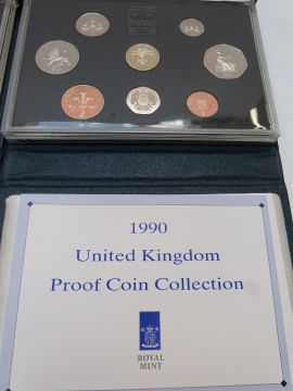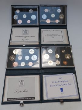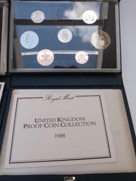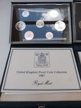 Royal Mint UK proof coin collections in deluxe cases with certificates, 1987-1990