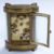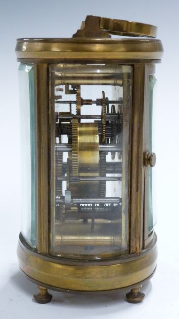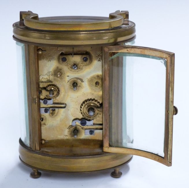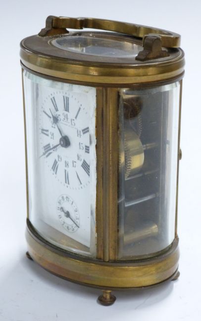Oval cased brass carriage clock with Roman and Arabic enamelled dial marked Deutsch, J Faubourg, secondary dial for alarm on bell, H11cm