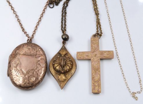 Victorian locket, 9ct gold chain, a 9ct gold cross pendant (6g) with chased engraving and a Victorian pendant