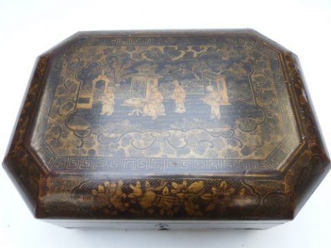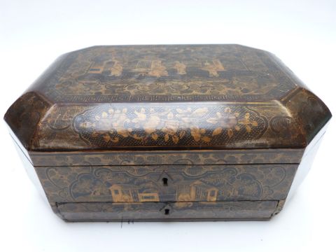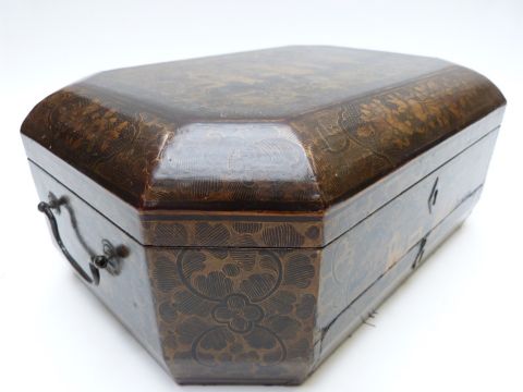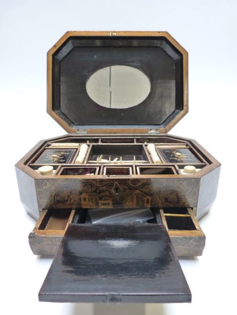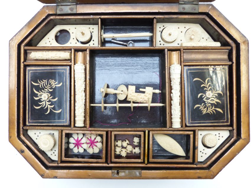 A 19thC Chinese sewing / needlework octagonal lacquer workbox with fitted interior and carved ivory accessories, W33 x D24 x H13cm