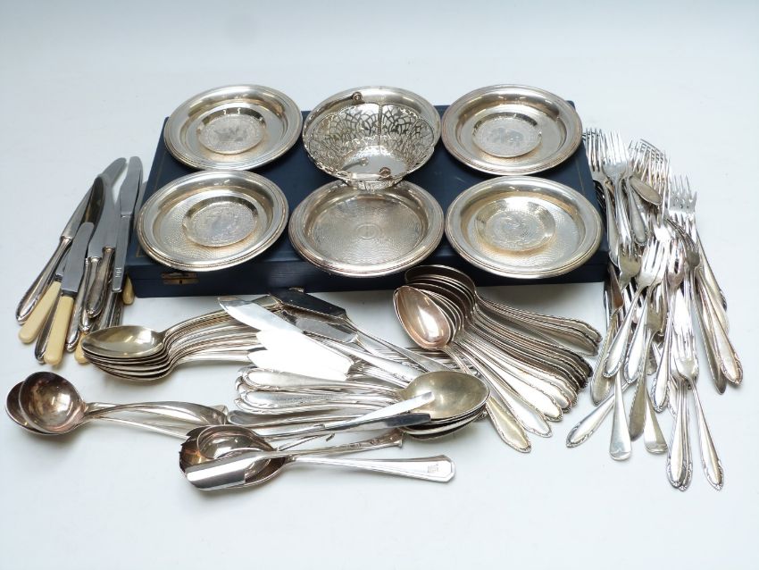 Cased set of silver plated cutlery together with a quantity of loose silver plated cutlery, much marked Wellner patent 90, small swing handled silver plated basket etc