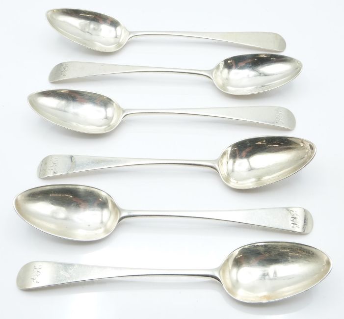 Georgian set of six hallmarked silver dessert or large teaspoons, London 1788 maker Thomas Wallis II, length 17.5cm, weight 186g