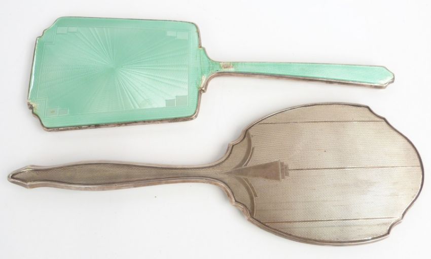 Two hallmarked silver hand mirrors, one with green guilloché enamel decoration, ivorine travelling mirror and a pair of Mappin & Webb plated asparagus servers etc