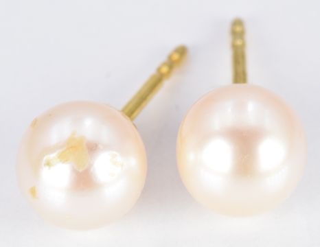 A pair of yellow metal earrings set with pearls