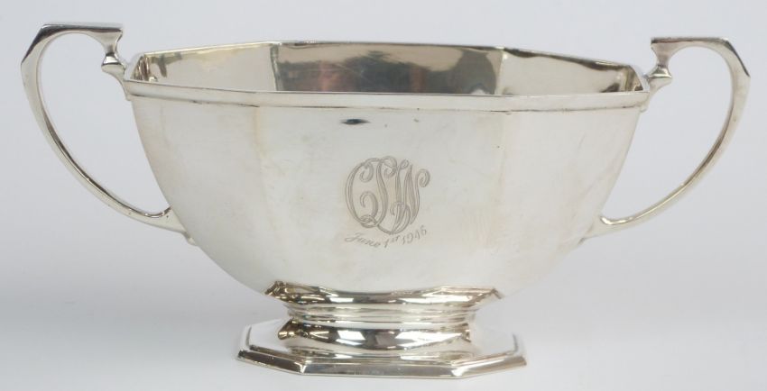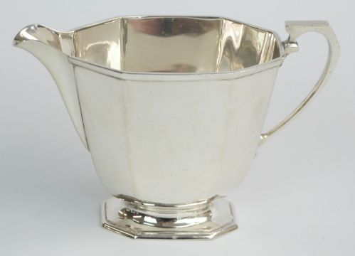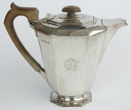 George VI hallmarked silver four piece pedestal teaset, Sheffield 1945 maker Frank Cobb & Co Ltd, length of teapot 29.5cm, weight 1635g all in