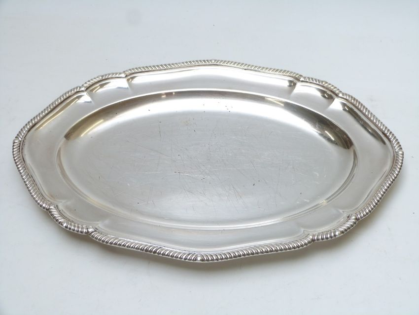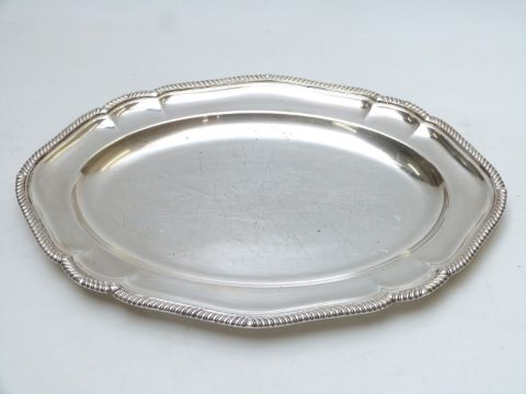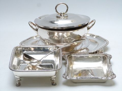 Plated ware including pedestal soup tureen, food servers, trays / salvers, width of largest 42cm