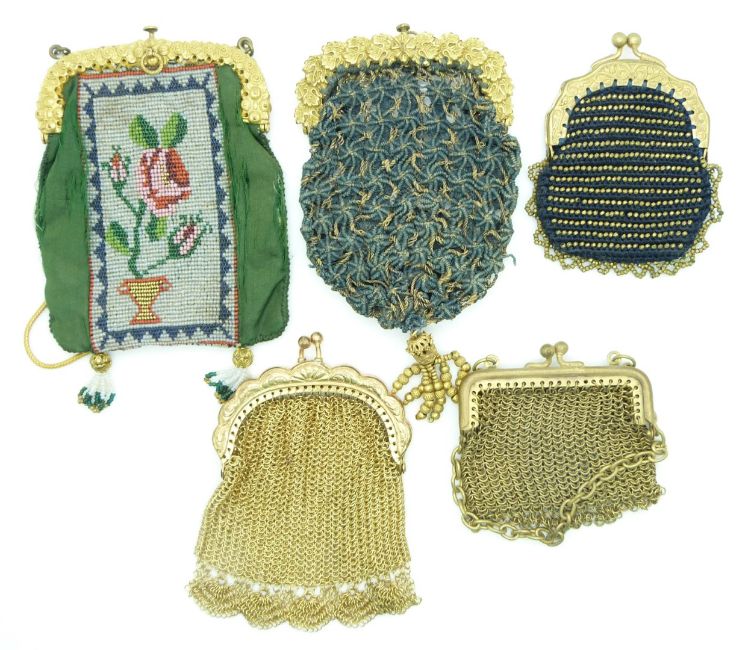 Five 19thC embroidery, beadwork and chain link purses with decorative gilt clasps, largest 12 x 8cm