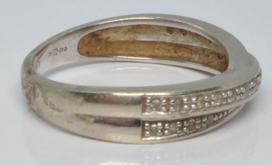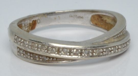 A 9ct white gold ring set with diamonds in a cross over setting, 2.8g, size M