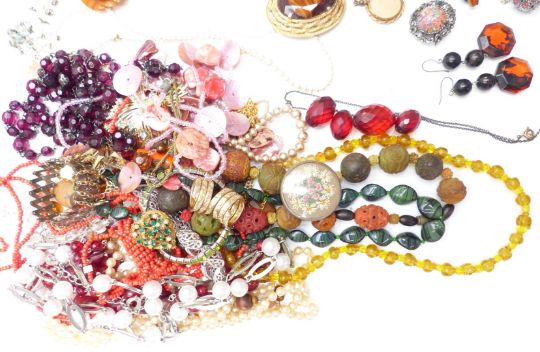 A collection of costume jewellery including watches, silver pocket watch, Victorian locket, carved beaded necklace, lockets etc