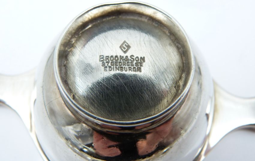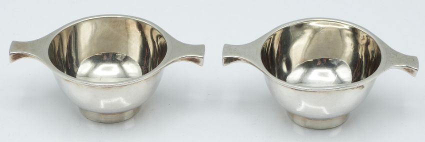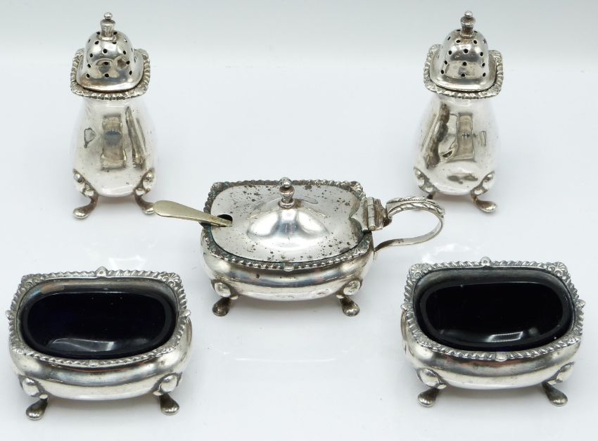 Five piece hallmarked silver cruet set, Birmingham 1923, further pepper and mustard, pair of Scottish hallmarked silver quaiches, Edinburgh 1923, maker Brook & Son, three Victorian Scottish hallmarked silver King's pattern teaspoons and two pairs of hallmarked silver sugar tongs, weight of silver 481g, together with a small Eastern white metal model sailing boat, height 9cm and various silver plated cutlery
