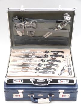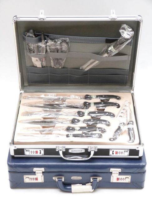 Berghaus stainless steel cutlery set in briefcase type case together with a similarly cased knife set, width of larger case 46cm