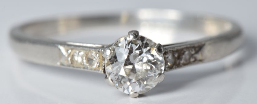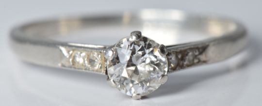 Art Deco platinum ring set with a diamond of approximately 0.3ct, with diamond encrusted shoulders, 2.5g, size N/O