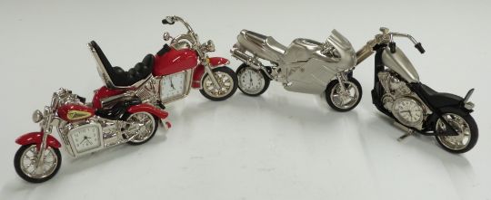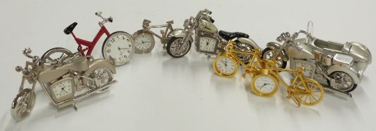 A collection of novelty miniature clocks relating to motorcycles and cycles