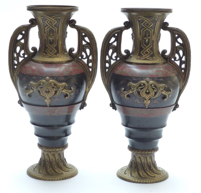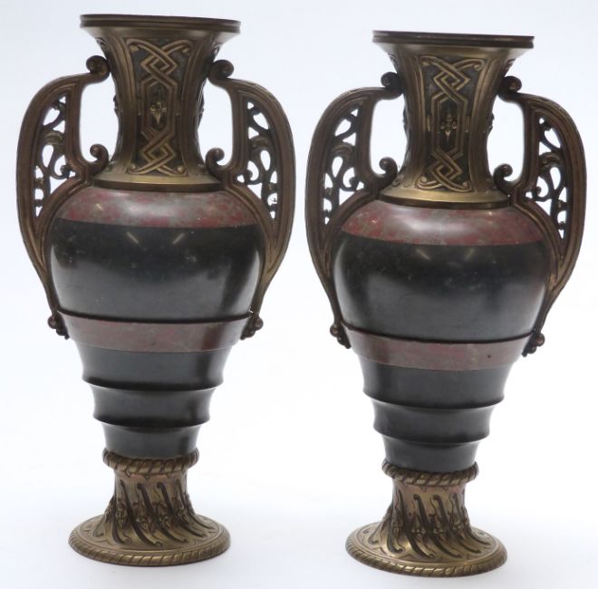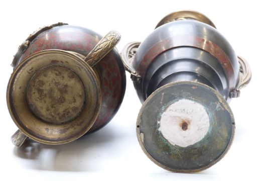 19thC pair of bronze mounted and marble twin handled decorative urns, height 30cm