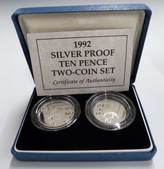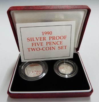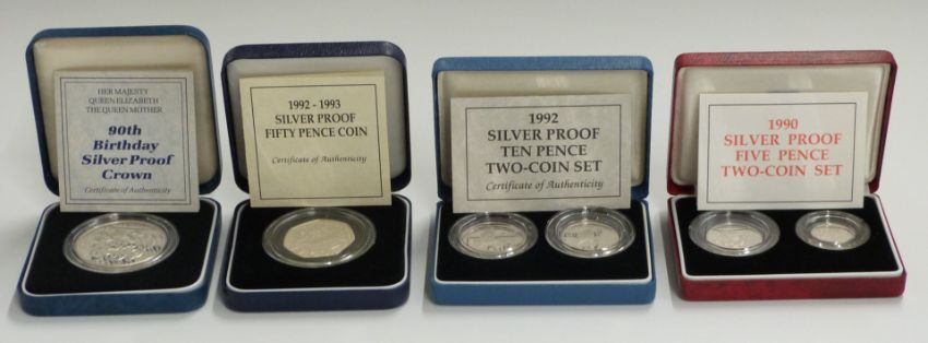 Four Royal Mint cased silver proof coin sets comprising 1990 old design / new design 5p, 1992 old design / new design 10p, a 1992-93 50p and a 1990 £5 example, all cased with certificates