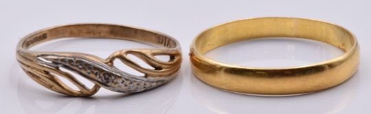 A 22ct gold wedding band/ ring, London 1885, (1.3g, size L) and 9ct gold ring, (1g, size K)