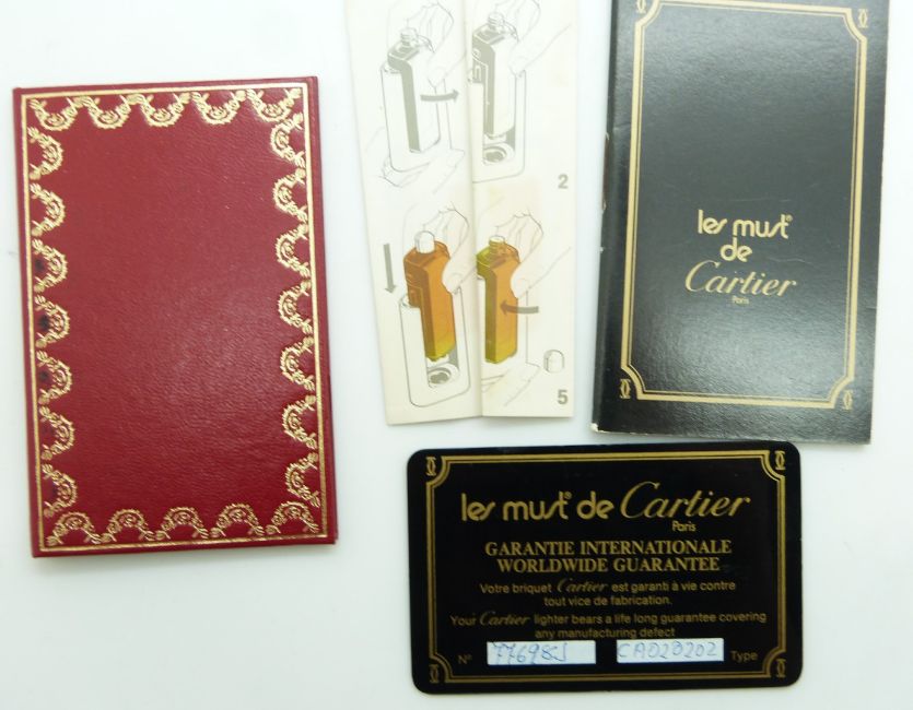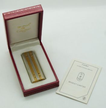 Cartier silver and gold plated lighter with screwed on panel decoration, in original Must de Cartier box with paperwork
