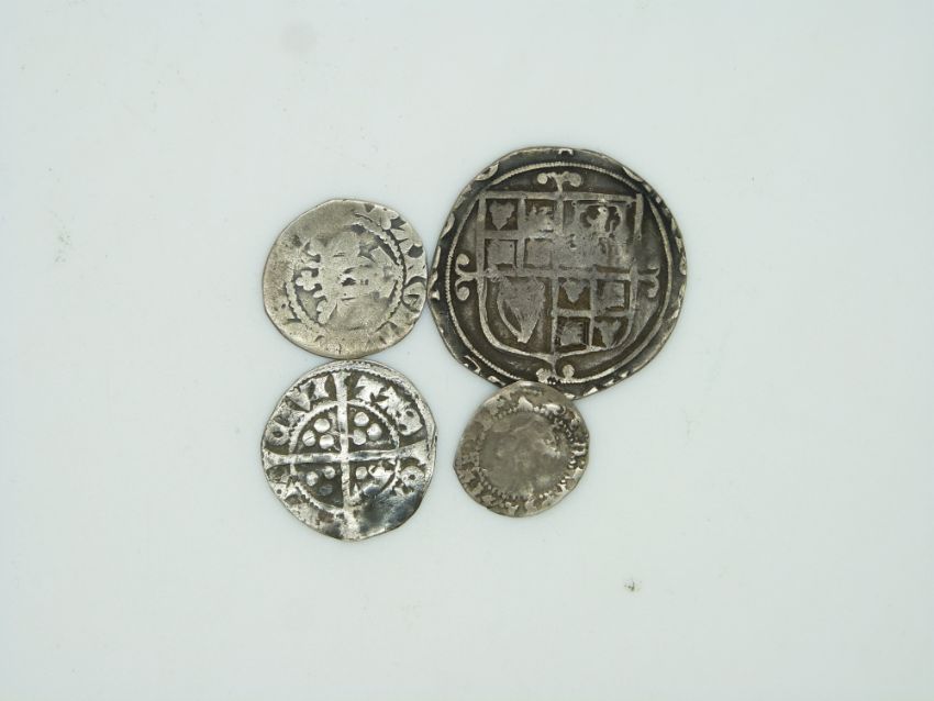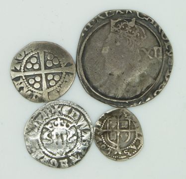 Charles I Parliament shilling, clipped, together with an Elizabeth I hammered penny, and two Edward II hammered pennies