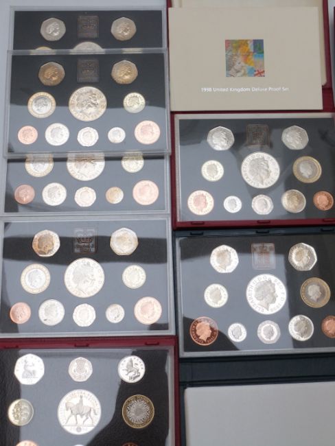 A collection of Royal Mail United Kingdom proof coins / coin sets including five Deluxe editions for 1998,1998 Deluxe set, 2002 Deluxe and two 2007 Deluxe with certificates, three sets with outer boxes (Ian Rank-Broadley Collection)