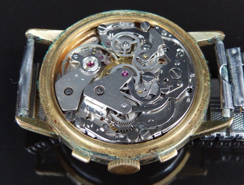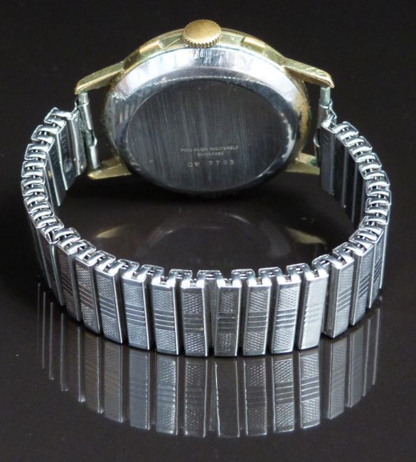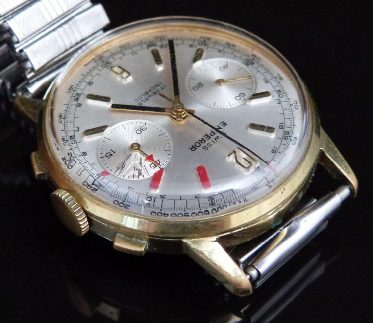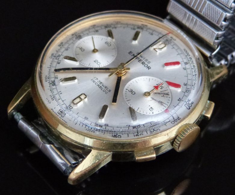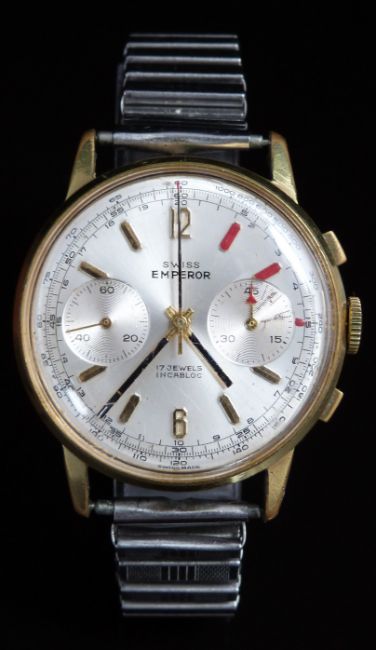 Swiss Emperor gentleman's chronograph wristwatch with black hands, gold baton markers, inset subsidiary dials, silver dial, gold plated case and 17 jewel calibre 7733 movement, on expanding metal bracelet, case diameter 37mm